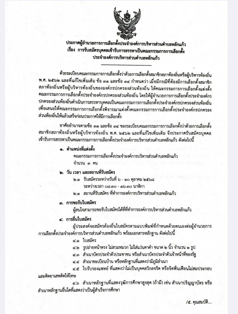 ประกาศผู้อำนวยการการเลือกตั้งประจำองค์การบริหารส่วนตำบลหลักแก้ว เรื่อง การรับสมัครบุคคลเข้ารับการสรรหาเป็นคณะกรรมการการเลือกตั้งประจำองค์การบริหารส่วนตำบลหลักแก้ว